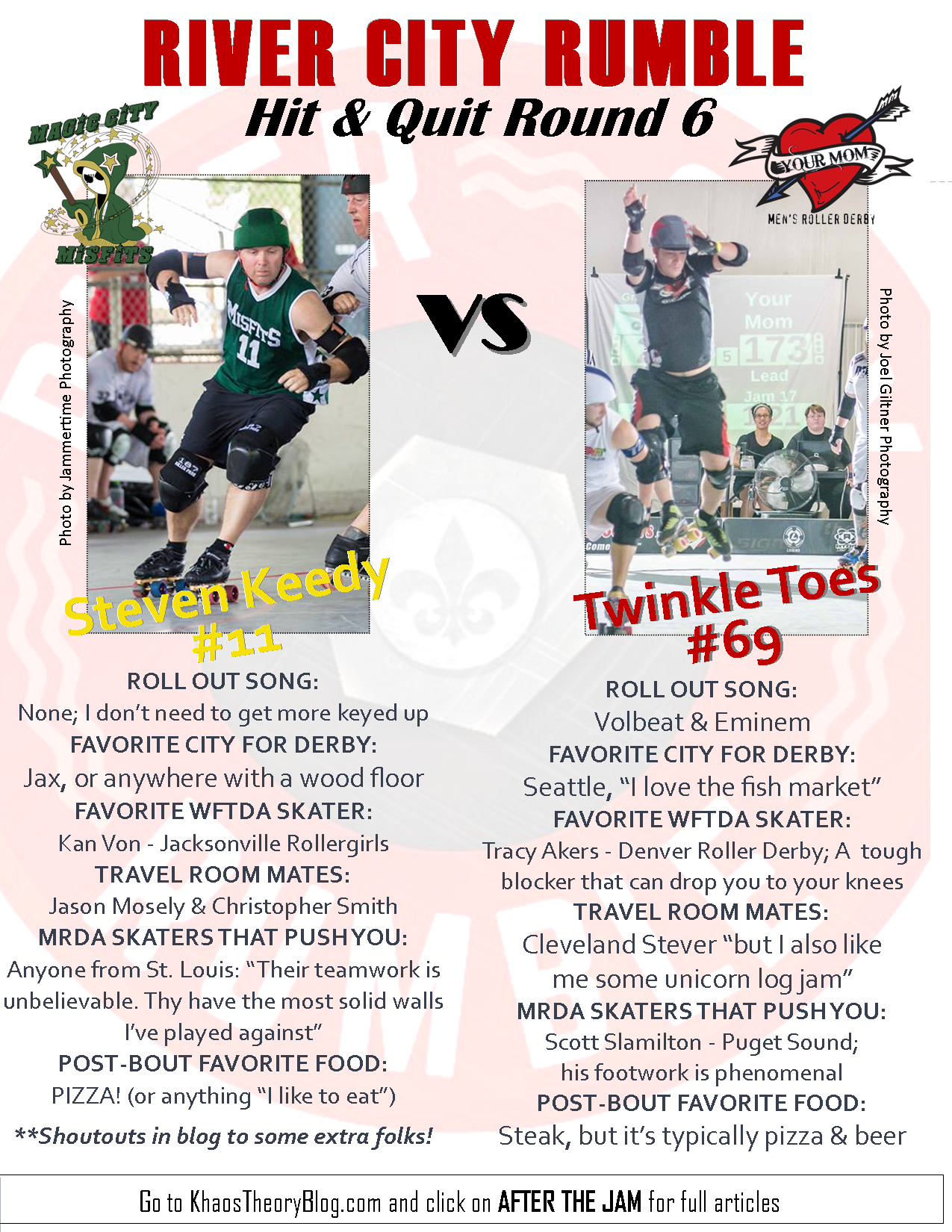5) Which MRDA skater pushes you to be better [because they’ve beaten you in the past]? Percy Controll has played a huge part in helping me become the player I am today and Bled Zeppelin… even though he picks on me at practice.