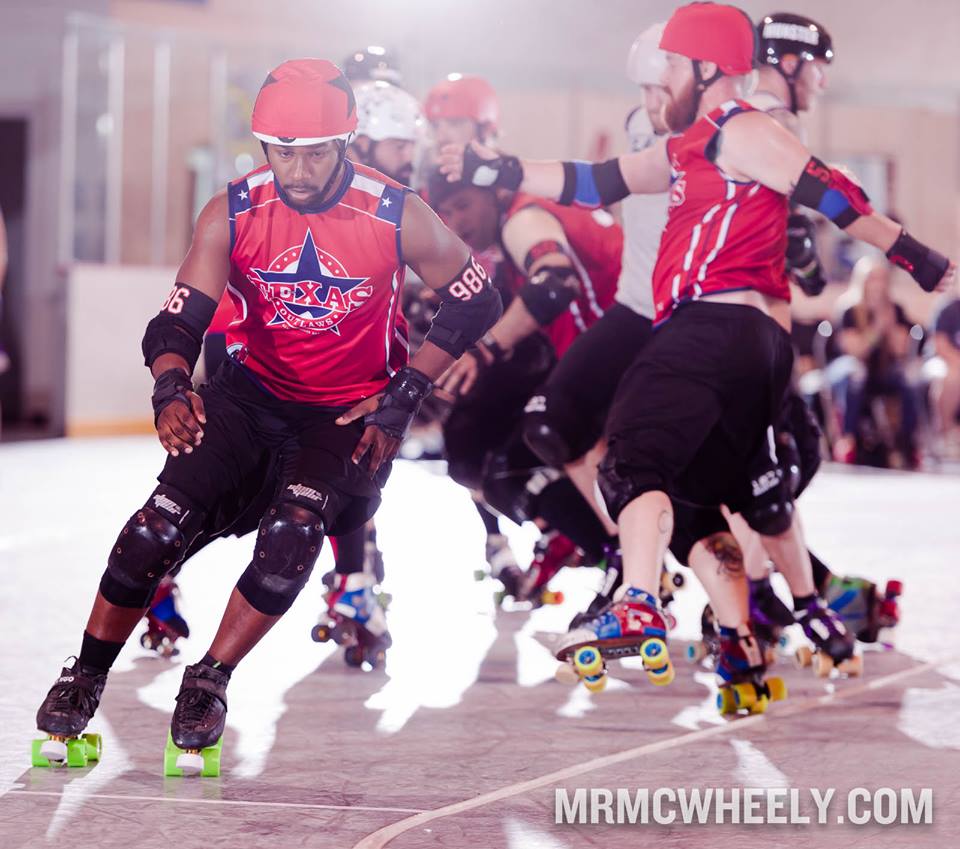So let’s talk Champs. Denton is facing off in the first round against Your Mom Men’s Roller Derby. To say they’re the underdog is a bit of an understatement. Especially since one of their primary jammers, aforementioned Haterade, is out recovering from surgery. Binkley says the guys aren’t looking at their underdog status as a negative stance though: